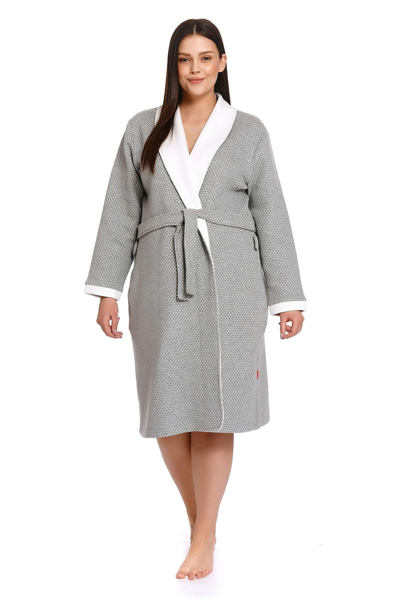 Dámsky župan 9276 Doctornap - sivý - z kvalitného žakárového úpletu - s bodkovaným vzorom - dlhé rukávy - pohodlné vrecká - so šálovým golierom v bielej farbe Zloženie materiálu: 50% bavlna + 50% polyester