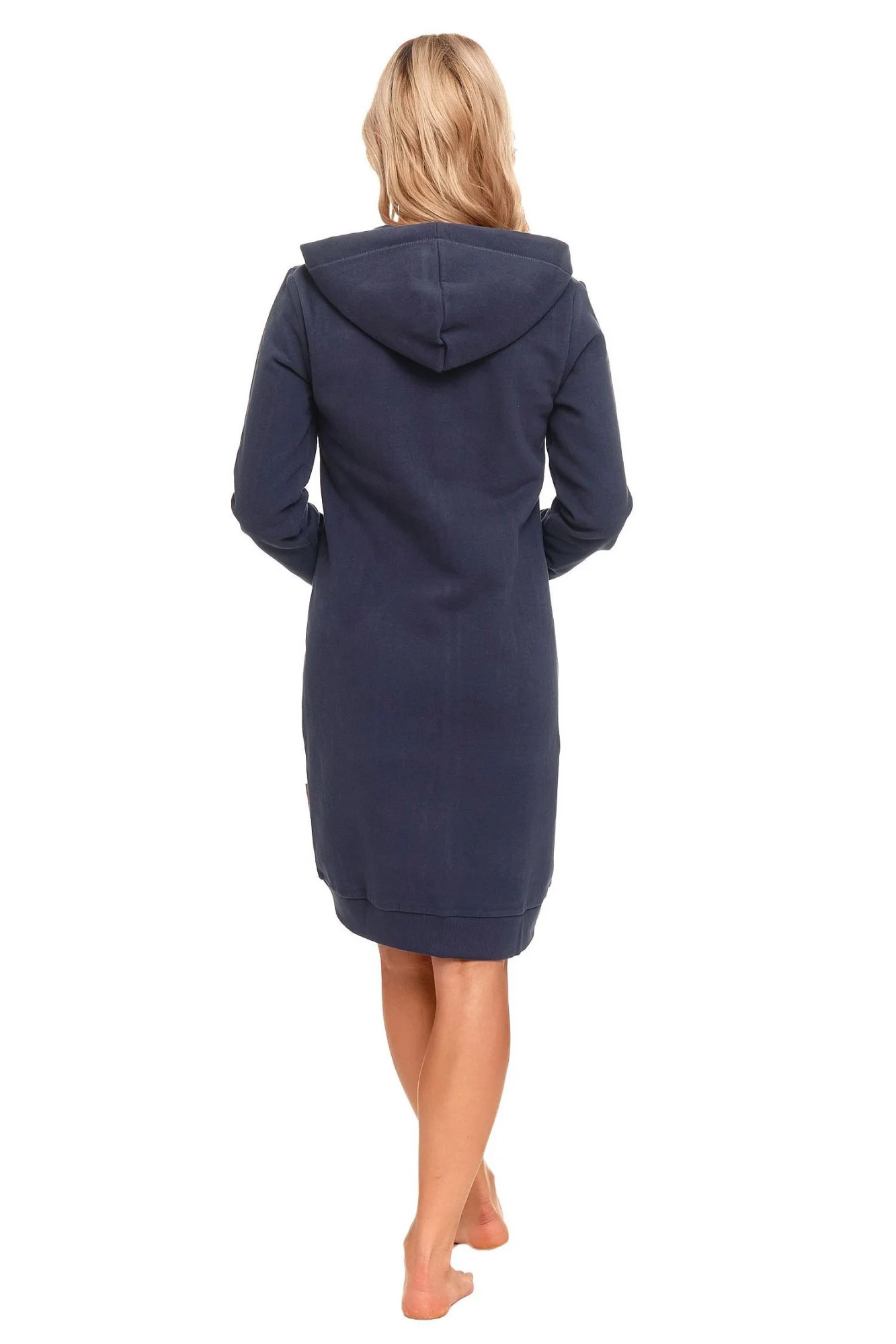 Dámsky župan 9756 Doctor nap - vyrobený z kvalitnej a príjemnej organickej bavlny - tmavomodrá farba - zapínanie na zips - s kapucňou - s vreckami - dĺžka nad kolená - certifikát OEKO-TEX Standard 100 Zloženie materiálu: 92% bavlna + 8% elastan
