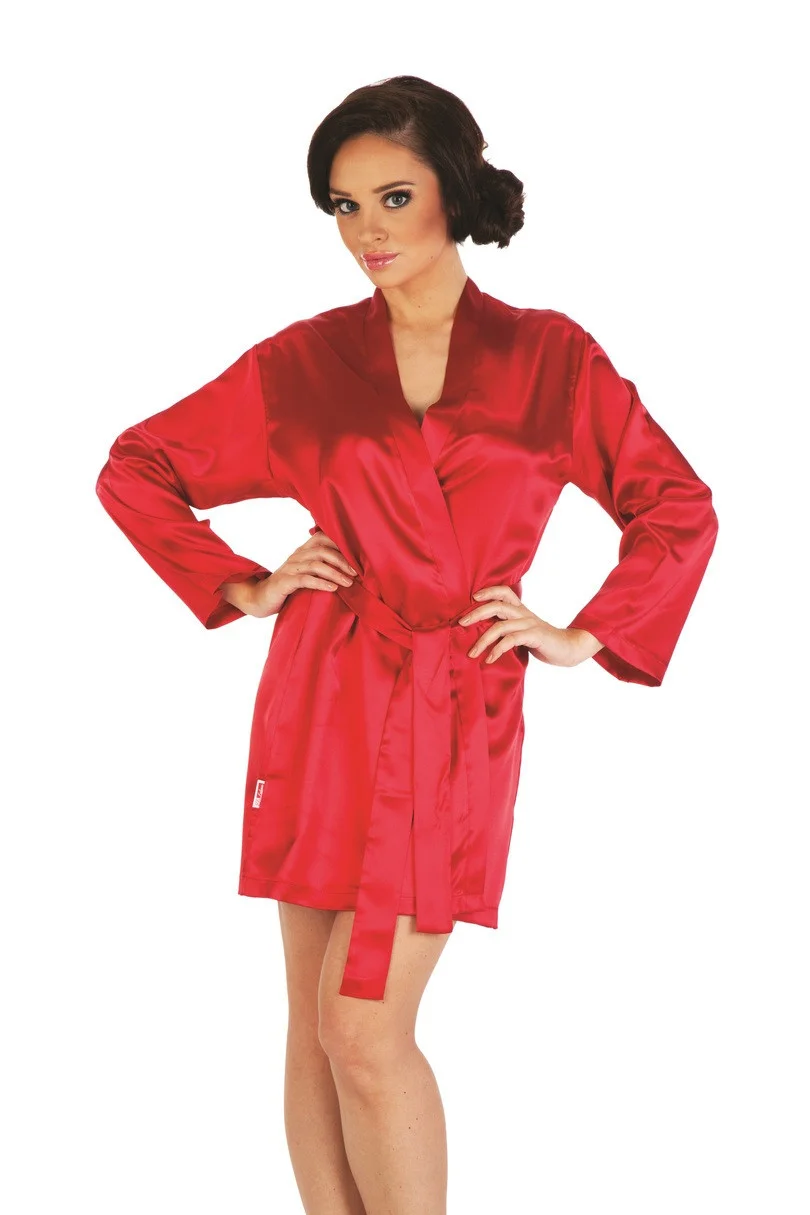 Krátky saténový župan, v Podväzkový páse na zaviazanie. 97% polyamid, 3% elastan.