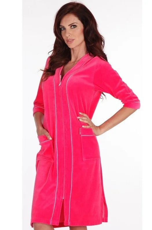 Krátky dámsky župan z príjemného velúru (bavlny 80%, polyamid 20%), s rukávmi 3/4 a zapínaním na zips, s dvomi pohodlnými vreckami.