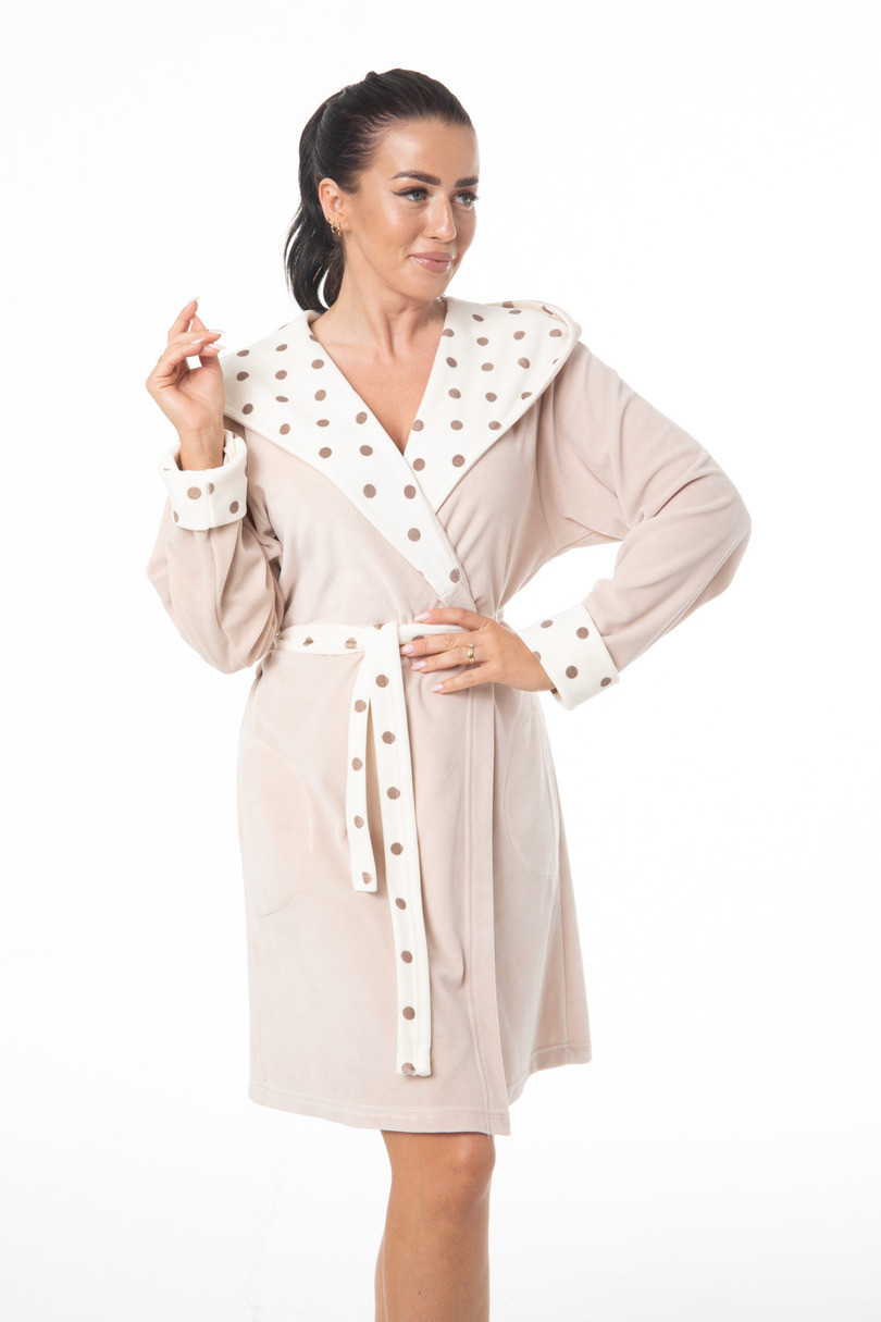 Dámsky župan Dorota FR-131 J/25 v sebe spája funkčnosť, pohodlie a elegantný dizajn. Je vyrobený z kvalitnej tkaniny, ktorá je z 80 % tvorená mäkkou a priedušnou bavlnou a z 20 % odolným polyesterom, takže poskytuje teplo a odolnosť. Krátky strih s praktickou kapucňou je ideálny na kúpanie a domáci relax. Model sa zaväzuje v páse, aby dokonale sedel, a vrecká na bokoch zvyšujú pohodlie pri používaní. Kapucňa a rukávy sú zakončené kontrastnou tkaninou, ktorá im dodáva moderný a štýlový charakter..