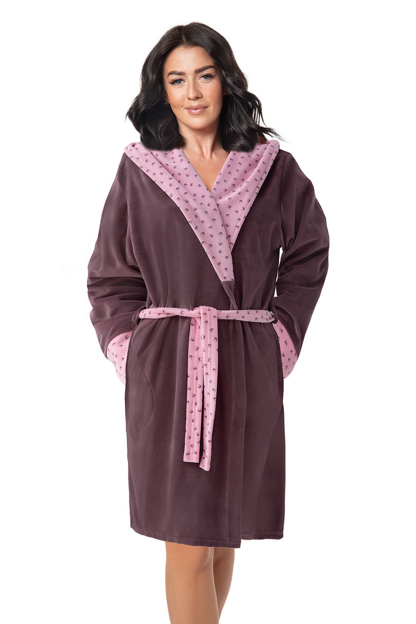 Dámsky župan Dorota FR-131 J/25 v sebe spája funkčnosť, pohodlie a elegantný dizajn. Je vyrobený z kvalitnej tkaniny, ktorá je z 80 % tvorená mäkkou a priedušnou bavlnou a z 20 % odolným polyesterom, takže poskytuje teplo a odolnosť. Krátky strih s praktickou kapucňou je ideálny na kúpanie a domáci relax. Model sa zaväzuje v páse, aby dokonale sedel, a vrecká na bokoch zvyšujú pohodlie pri používaní. Kapucňa a rukávy sú zakončené kontrastnou tkaninou, ktorá im dodáva moderný a štýlový charakter..