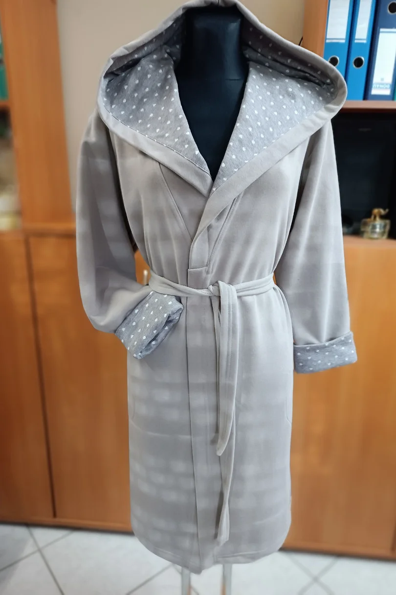 Elegantný dámsky župan, viazaný, z bavlneného úpletu, dostupný v dvoch farbách. župan s kapucňou. manžety a kapucňa zdobené vzorovanou látkou. Zloženie