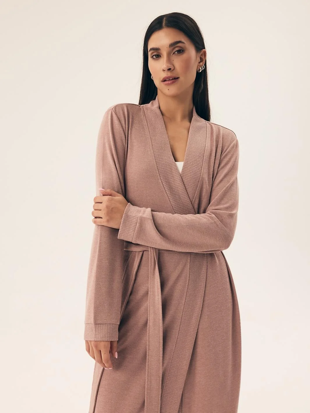 Dámsky župan - vysokokvalitná pletenina - dlhé rukávy - zaväzovanie v páse - dĺžka po kolená Zloženie: 82 % polyester, 14 % viskóza, 4 % elastan