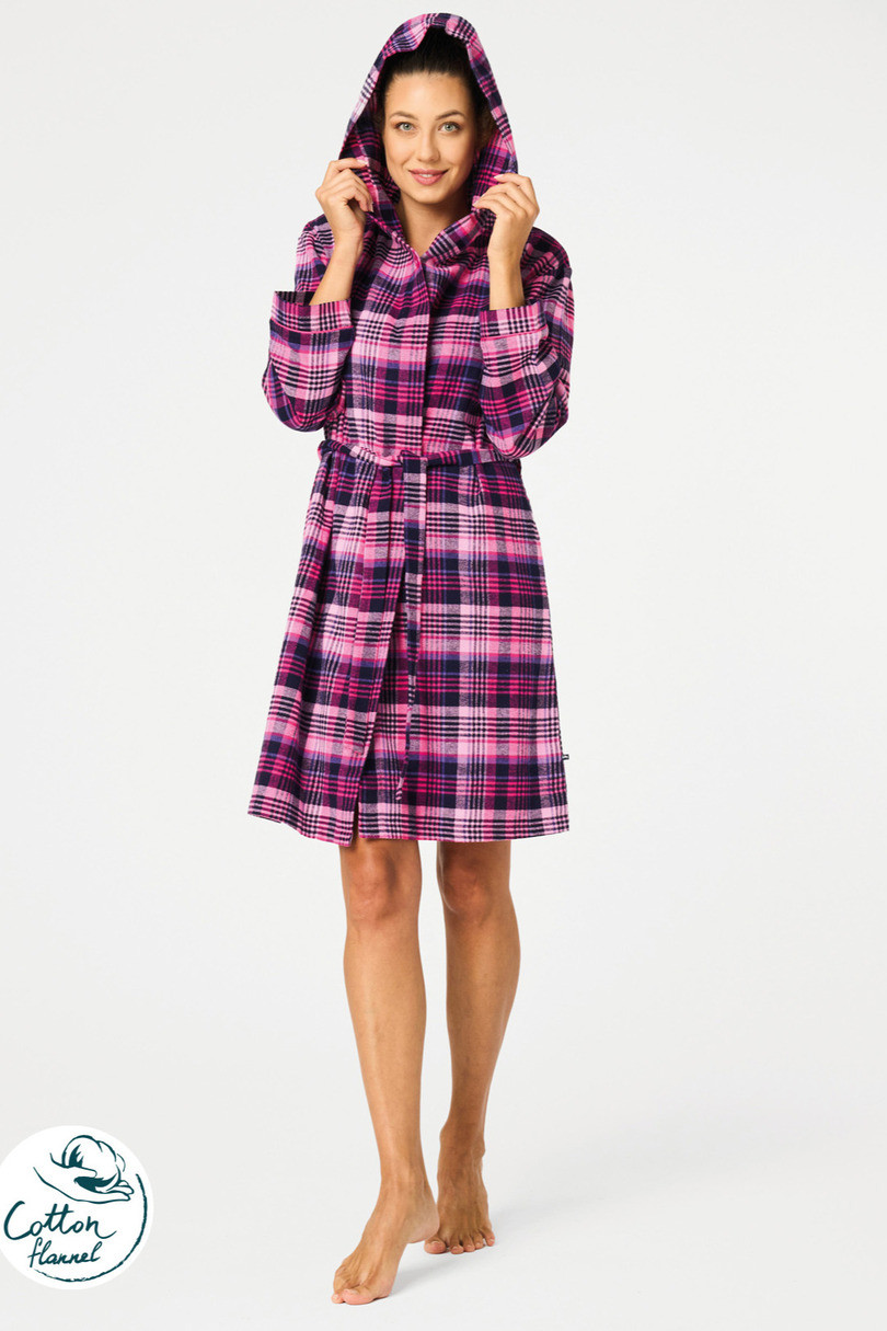 Dámsky župan LGD 490 v sebe spája teplo, pohodlie a ženský štýl. Je vyrobený z vysokokvalitného bavlneného flanelu, je výnimočne mäkký a príjemný na dotyk a zároveň poskytuje vynikajúcu izoláciu v chladnejších dňoch. Klasický ružovo-čierny károvaný vzor mu dodáva nadčasový vzhľad. Má praktickú kapucňu, ktorá chráni pred chladom, zaväzovanie v páse a praktické vrecká na udržanie rúk v teple alebo na uloženie nevyhnutných vecí. Ideálny na hodenie po kúpeli, rannej sprche alebo na relaxačný večer doma. 100 % bavlnený flanel