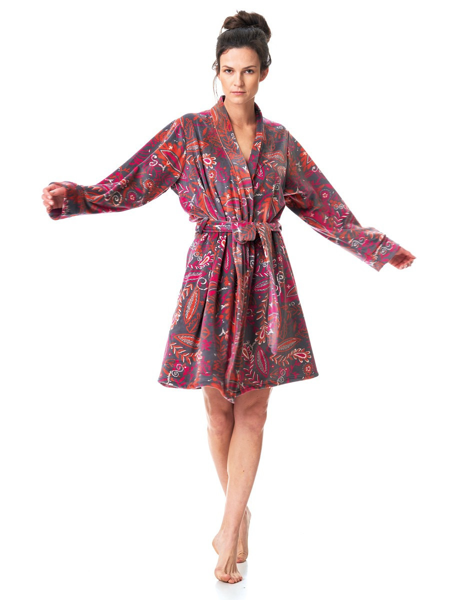 Dámsky krátky župan - teplý, veľmi mäkký mikroflís - farebná kvetinová potlač - dlhé rukávy - zaväzovanie v páse - vrecká na bokoch - dĺžka pred kolená Zloženie materiálu: 95 % polyester, 5 % elastan