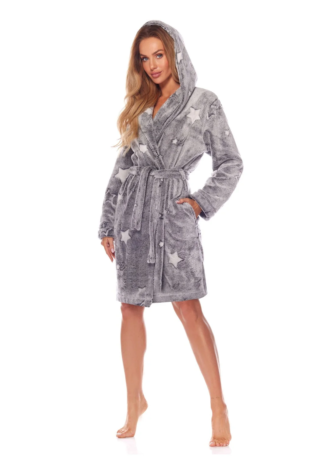 Krátky dámsky župan, ktorý je vyrobený z mäkkej tkaniny typu "soft". Župan má kapucňu, dlhé rukávy a vrecká. Model sa v páse zaväzuje. Zloženie: 100% polyester.