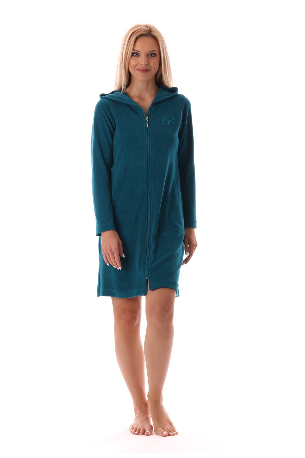 Ľahký trojštvrťový dámsky župan Bari s kapucňou na zips ležérny strih s kapucňou a dvoma bočnými vreckami ľahký pletený froté materiál 80 % bavlna 20 % polyester príjemný pocit vďaka elastickému materiálu zapínanie na zips na jednoduché obliekanie Ľahký, pohodlný krátky župan s kapucňou na zips je ideálny aj ako domáce oblečenie. Skvele sa hodí aj na cestovanie. V termálnych kúpaliskách okrem rýchleho zapínania oceníte aj kapucňu, ktorá udrží krk v teple, ak máte pri prechode medzi bazénmi mokré vlasy.