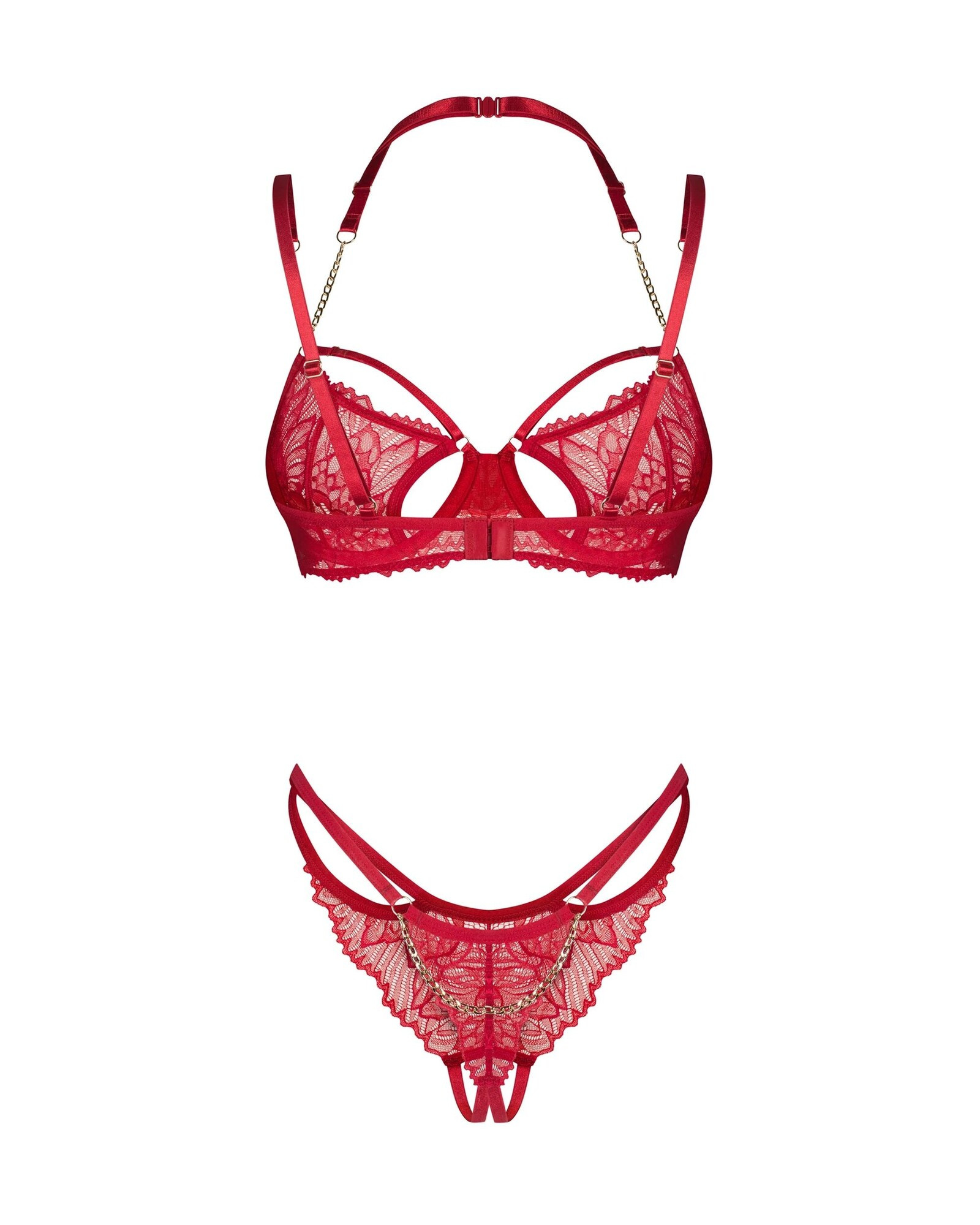 Sýtočervená farba, elegantná čipka a detaily, ktoré nikto neprehliadne. Podprsenka s kosticami jemne zvýrazňuje poprsie, zatiaľ čo zlaté retiazky na ramienkach dodávajú jedinečný nádych. Tanga s otvoreným rozkrokom, zdobené čipkou a trblietavou retiazkou na chrbte, sú čistou fantáziou. Každý detail tu má svoj význam - dokonca aj malý prívesok vpredu, ktorý koketne upúta pozornosť. Je to viac než len spodná bielizeň. Je to prísľub večera plného rozkoše a vášne. - podprsenka s kosticami - ozdobné ramienko na krk s retiazkami - čipkované tangá s otvoreným rozkrokom a retiazkou na chrbte - ozdobný prívesok na prednej strane - podprsenka má nastaviteľné ramienka a pásik za krk - viacstupňové zapínanie na chrbte Materiálové zloženie: 90 % polyamid, 10 % elastan