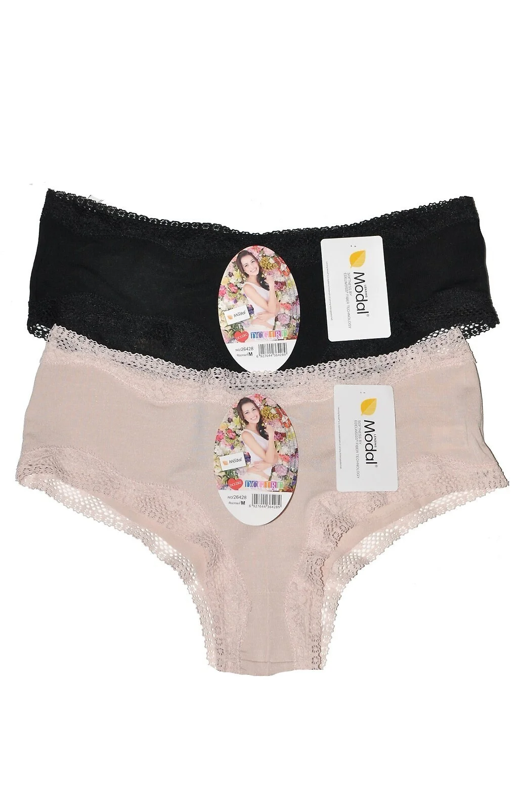 Dámske nohavičky z modalu príjemného na telo - klasický strih - pás a nohavice zdobené čipkou - zvislý šev na prednej a zadnej strane - balené v polyetylénovom vrecku po 12 kusoch - náhodne vybrané farby: ecru, béžová, piesková, čierna Zloženie: 94 % modal, 6 % elastan