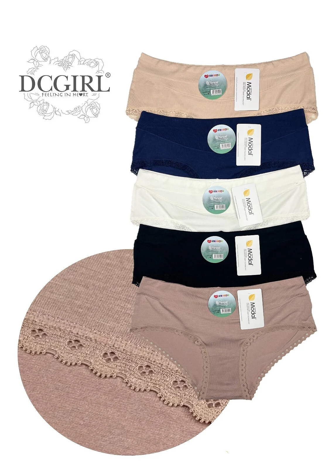 Dámske nohavičky z modalu príjemného na telo - klasický strih - nohavice zdobené čipkou - hladký pás - balené v polyetylénovom vrecku po 12 kusoch - náhodne vybrané farby: ecru, béžová, tmavomodrá, čierna, moka Zloženie: 94 % modal, 6 % elastan