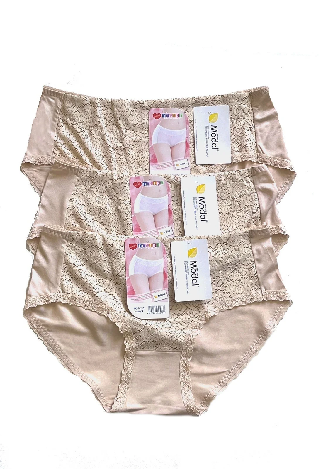 Jednofarebné dámske nohavičky - modal príjemný na telo - mierne nariasené na bokoch - predná časť z jemnej čipky - balené vo fóliovom vrecku po 12 kusoch - dostupné veľkosti v balení: S, M, L, XL Zloženie: 94 % modal, 6 % spandex
