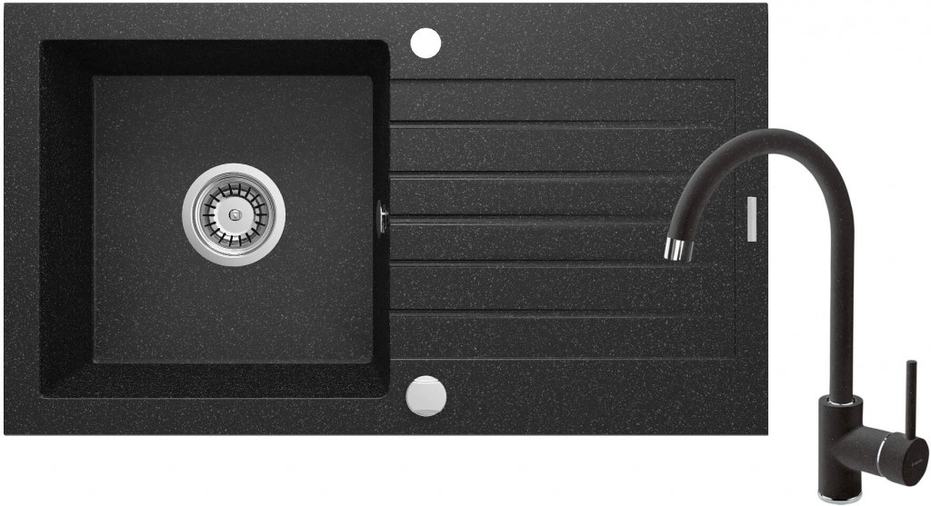Granitový drez s batériou tvorí kompletnú kuchynskú zostavu. Bola vyrobená z odolnej prírodnej žuly, ktorá je odolná nielen voči vysokej teplote a jej výkyvom, ale aj nárazom a zmene farby, v súlade s európskou normou PN-EN 13310. Navyše je obohatená o hydrofóbnu vrstvu, ktorá uľahčuje tok jednotlivých kvapiek. V rovnakej farbe je aj vodovodná batéria s pohodlnou výlevkou. Praktický 1-miskový drez s odkvapkávačom je perfektným riešením v malých kuchyniach a štúdiových bytoch s kuchynským kútom. Funguje aj ako sušička, profilovaný povrch účinne odvádza vodu stekajúcu z riadu alebo umytého jedla. Vlastnosti žuly Deante: odolnosť proti nárazu, vysokej teplote, zmene farby, tepelnému šoku Kovanie s automatickým uzáverom odtoku Drez je vybavený príslušenstvom s pripojením na umývačku Hydrofóbne vlastnosti odpudzujú molekuly vody Ponuka zahŕňa špeciálny bezpečný prostriedok na čistené povrchy Vrátane spojovacích hadíc Batéria je vybavená perlátorom, ktorý prúd prevzdušňuje Najdlhšia záruka 18 rokov Priestorovo úsporný sifón na uľahčenie napr. triedenia odpadu Obojstranný drez - inštalujte s misou vľavo alebo vpravo Montážne puzdro uľahčuje inštaláciu batérie (GT) Ean: 5908212048566