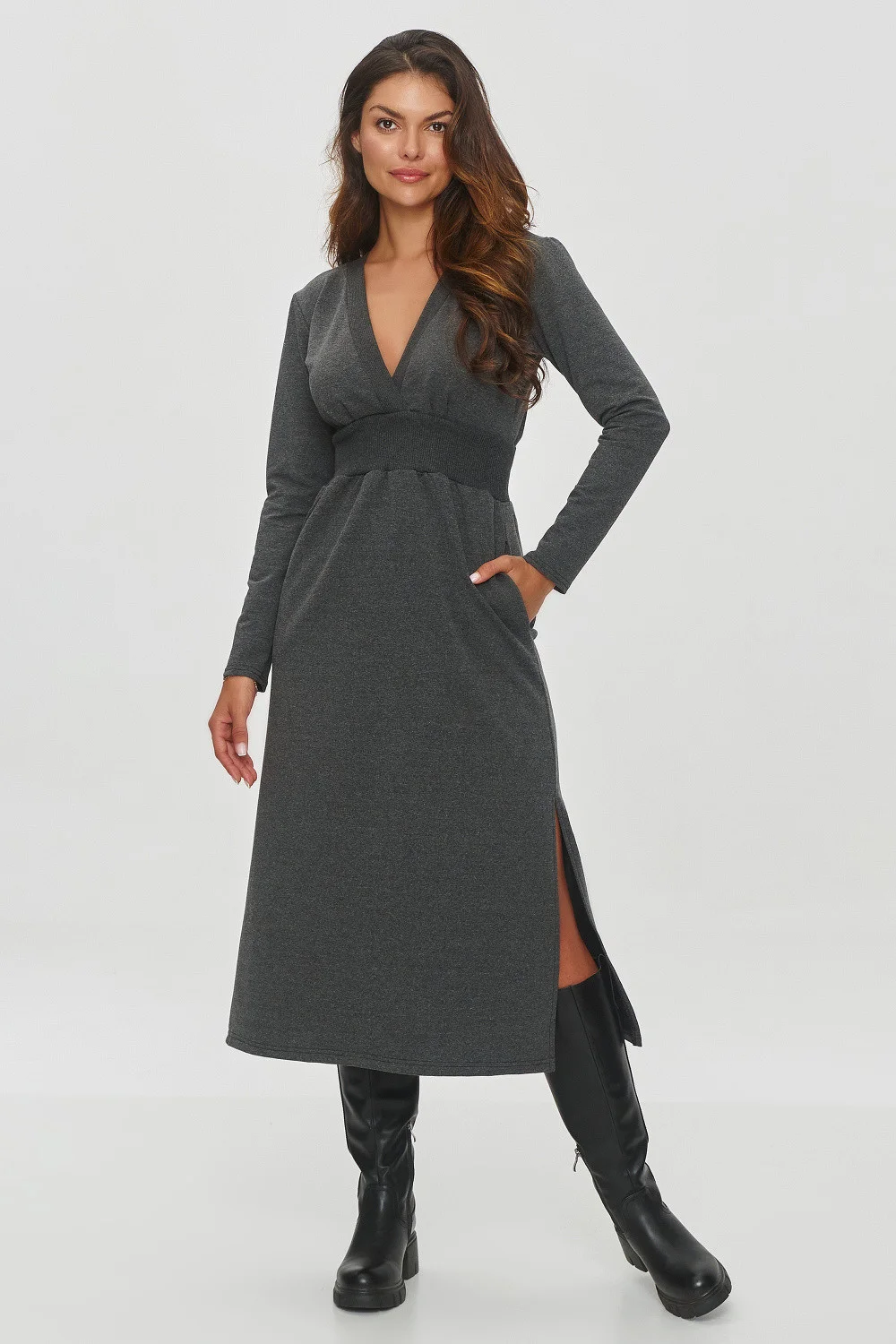 Dresové šaty jsou návrhem s klasickým, ale moderním střihem. Model má midi délku, sahající pod kolena, s přiléhavým vrchem a jemně rozšiřující se sukní. Je vyroben z elastického materiálu, který se dobře přizpůsobí postavě a poskytuje pohodlí při nošení. Překládaný výstřih dodává šatům eleganci a zdůrazňuje linii prsou. Pod prsy se nachází elastický, široký pás z gumy, který opticky zúží pas a dodá postavě proporcionální vzhled. Model má dlouhé rukávy, což ho činí ideálním na chladnější dny. Na bocích šatů jsou kapsy, což jim dodává praktičnost a uvolněný charakter, stejně jako rozparky, které zdůrazňují ženskost a usnadňují pohyb. Šaty lze kombinovat s černými pracovními botami, což stylizaci dodá trochu drsnější charakter, ideální na podzimní dny, nebo sportovním obuvem, kde získá více uvolněného, sportovního vzhledu. Tyto šaty jsou ideálním návrhem na každý den, ale také na formální příležitos bavlna 95%Elastan 5% Veľkosť DĺžkaObvod bokov Obvod cez prsia Obvod pása 36120 cm96 cm76 cm64-80 cm38120 cm100 cm80 cm68-84 cm40120 cm104 cm84 cm72-88 cm42120 cm108 cm88 cm76-92 cm