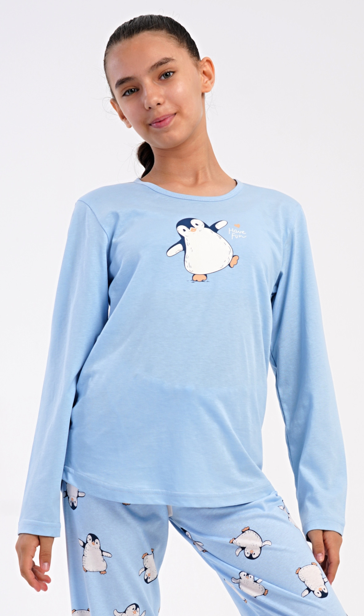 Dětské bavlněné dlouhé pyžamo Tučňák. Dívčí pyžamo se skládá z trika s dlouhým rukávem a dlouhých kalhot. Triko s kulatým výstřihem je ozdobeno obrázkem tučňáka. Tento motiv se opakuje i na kalhotách, které mají v pase gumu a šňůrku na stažení, nemají kapsy. Použitý bavlněný materiál je poddajný a příjemný na dotek. Pokyny pro údržbu: - 100% bavlna - lze prát v pračce při teplotě do 30° - nesušit v sušičce - žehlit z rubu do 110° - nepoužívat bělící prostředky - nečistit chemicky Míry naměřené na výrobku 5031620825 Tučňák 7-8 9-10 11-12 13-14 obvod hrudníku 72 76 80 82 délka trika 52 57 58 59 pas 52-64 56-68 60-72 64-76 délka nohavic 81 88 93 98