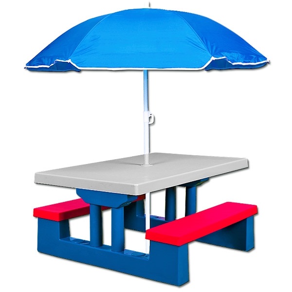 Detský plastový piknikový set Stôl s dvoma lavicami a pripevnený slnečník - umývateľný - Ľahko sa čistí - jednoduchá montáž a demontáž špecifikácie: - Rozmery stola: dĺžka: 67 cm x šírka 41 cm x výška: 47 cm - Rozmery lavice: dĺžka: 67 cm x šírka: 15,5 cm x výška: 24 cm - Nie je vhodné pre deti do 36 mesiacov - Materiál slnečníka: 100% polyester