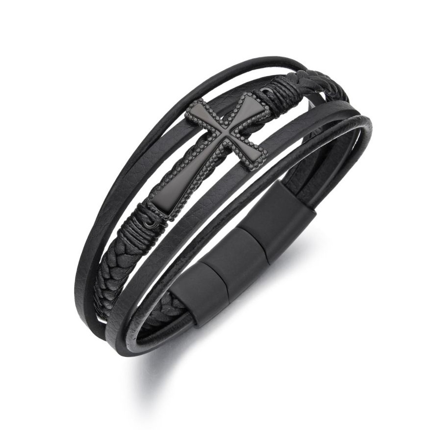 Diverse Čierny kožený náramok pre mužov Krížik B1000852