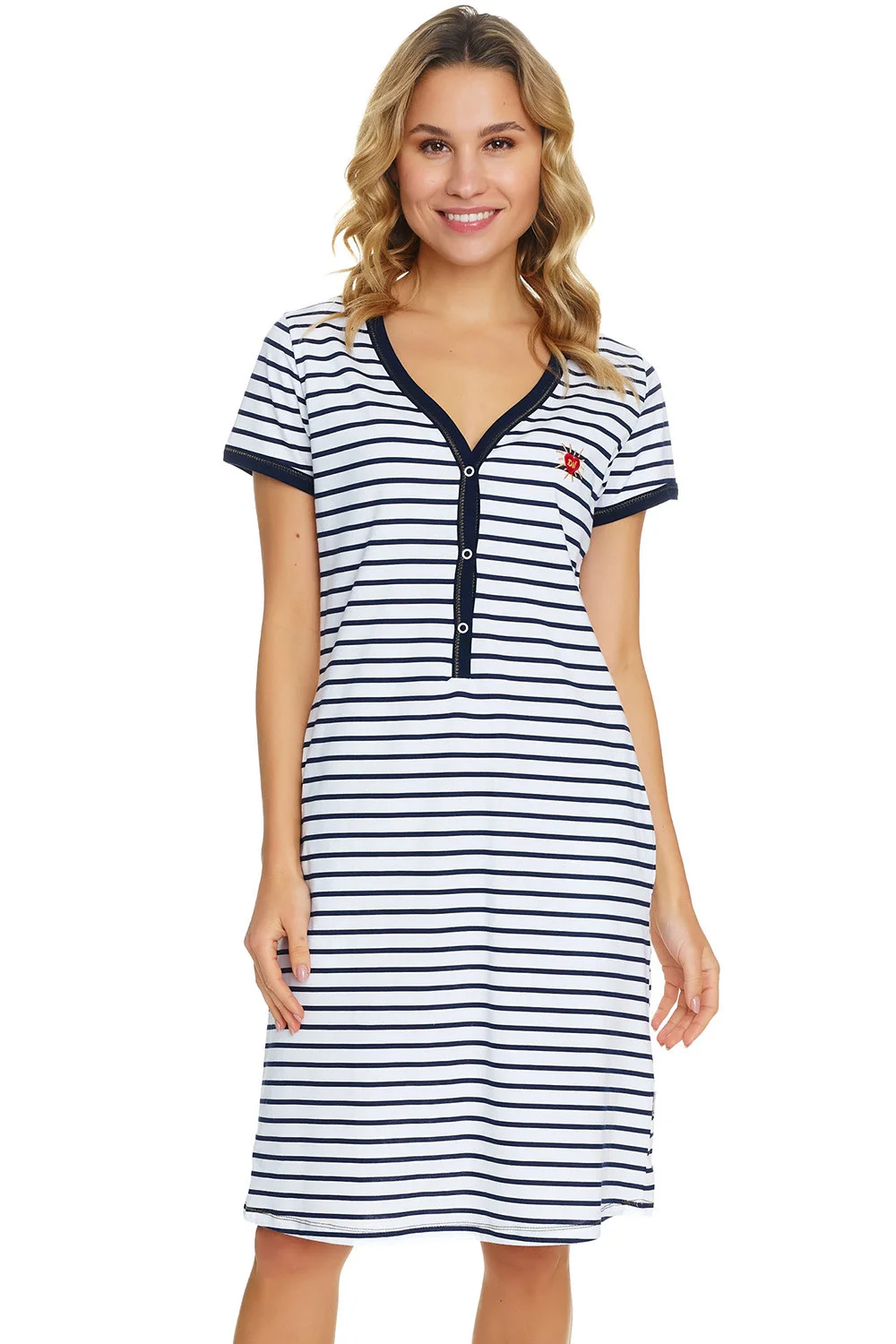 Nočná košeľa značky Doctor Nap. model TCB.5232. výrobok je vyrobený zo 100% bavlny. tehotenské oblečenie. miesto zapínania: vpredu. má vrecká. zapínanie nočnej košele na patentky. dĺžka rukávov: krátke. dĺžka: midi. dámsky výrobok.