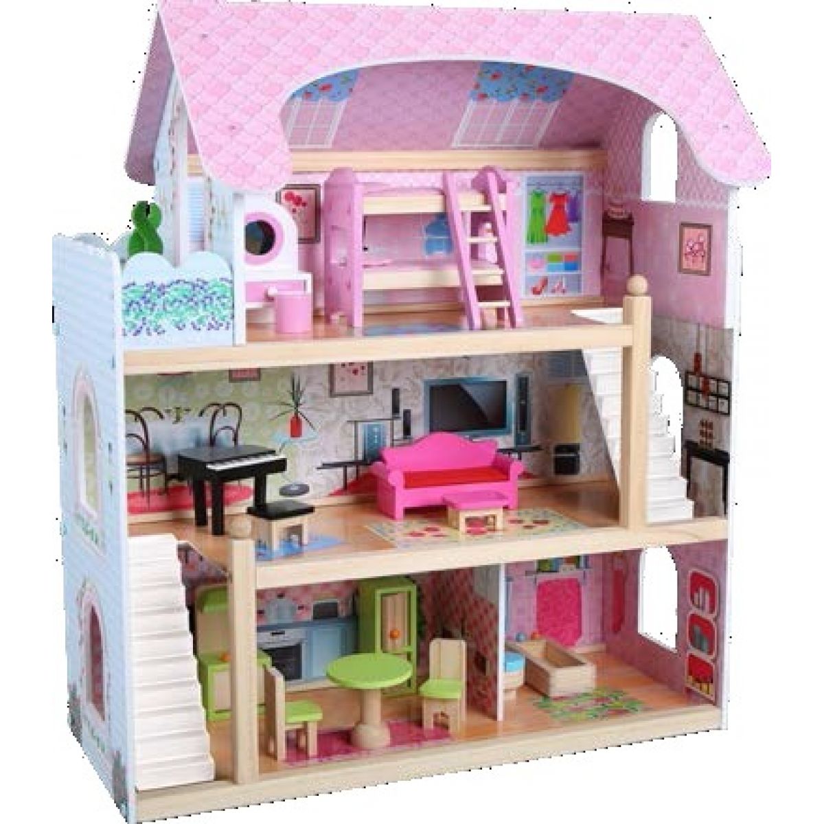 Trojposchodový drevený domček je určený pre hru s Pánek, ladený do jemných farieb.