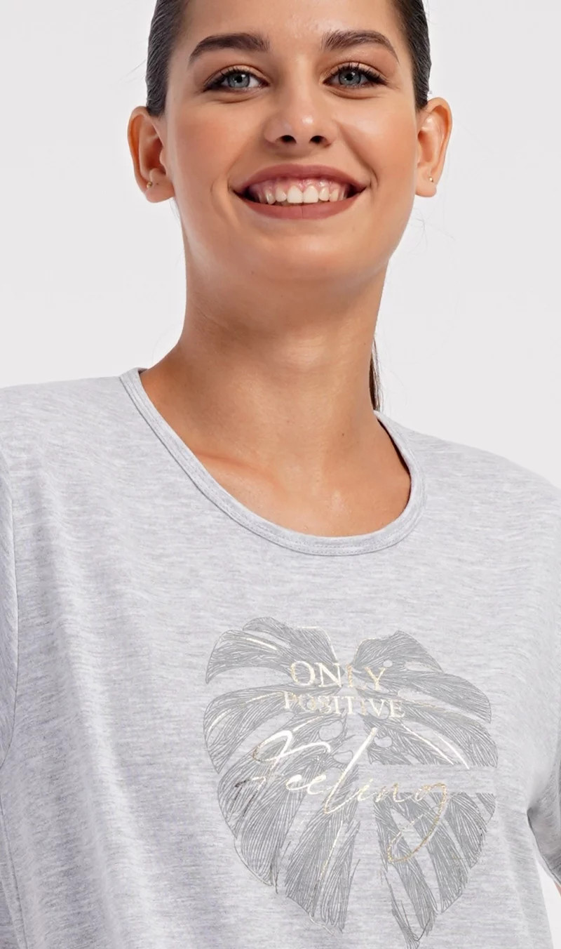 Dámske domáce šaty Elizabeth s krátkymi rukávmi. Domáce šaty v jednofarebnom vyhotovení s okrúhlym výstrihom a vreckami zdobí obrázok veľkého listu a nápis "Only positive feeling" (Len pozitívny pocit). Použitý bavlnený materiál je príjemný a pružný na dotyk. Šaty sú pohodlné a možno ich používať takmer na všetky voľnočasové aktivity. Sú vhodné na spanie aj na denné nosenie. Obsah bavlny tmavosivej farby je 100 % a svetlosivej farby 70 %. Pokyny na údržbu: -materiál: 70 % bavlna, 30 % polyester - možno prať v práčke do 30° - nesušte v sušičke - žehliť na rubovej strane do 110° - nepoužívajte bieliace prostriedky - chemicky nečistiť Rozmery namerané na výrobku: 4053560000 Elizabeth 1XL 2XL 3XL 4XL obvod hrudníka 124 130 136 142 obvod bokov 130 136 142 148 dĺžka 90 90 90 90
