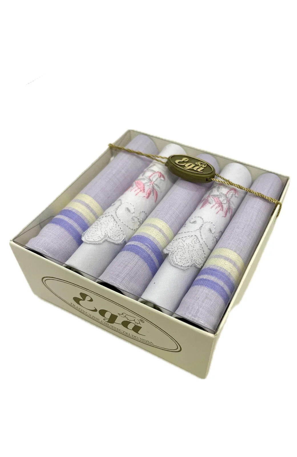 Dámske vreckovky - vyrobené z jemne tkanej bavlny - dva kusy zdobené jemnou kvetinovou výšivkou - balené po piatich kusoch v elegantnej škatuľke - veľkosť 30x30 cm - náhodne vybrané dostupné farby: modrá, ružová, biela, vres Zloženie: 100 % bavlna