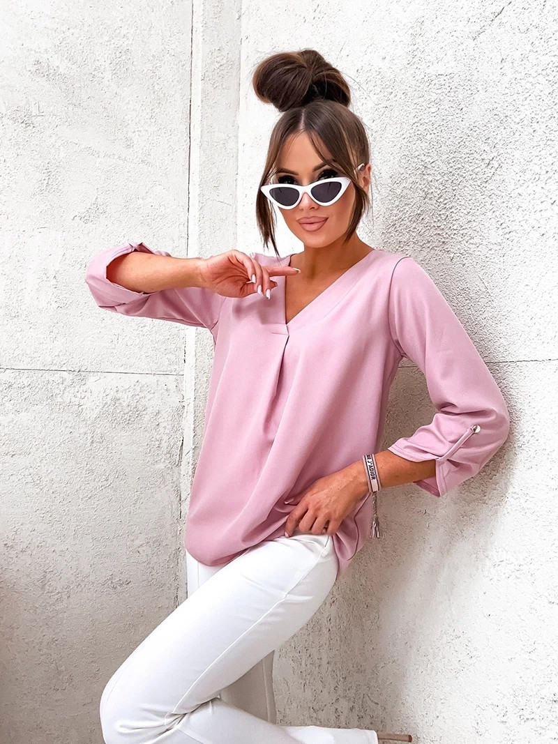 Pri výbere veľkosti venujte pozornosť nižšie uvedenej veľkostnej tabuľke. Veľkosti nezodpovedajú bežne nosenému oblečeniu. Blúzka s 3/4 rukávmi Blúzka má jednoduchý strih a výstrih do V. Rukávy sú naberané a podviazané. Model je v dĺžke do bokov. Blúzka je poľský výrobok. Zloženie: 65 % polyester, 30 % viskóza, 5 % elastan.