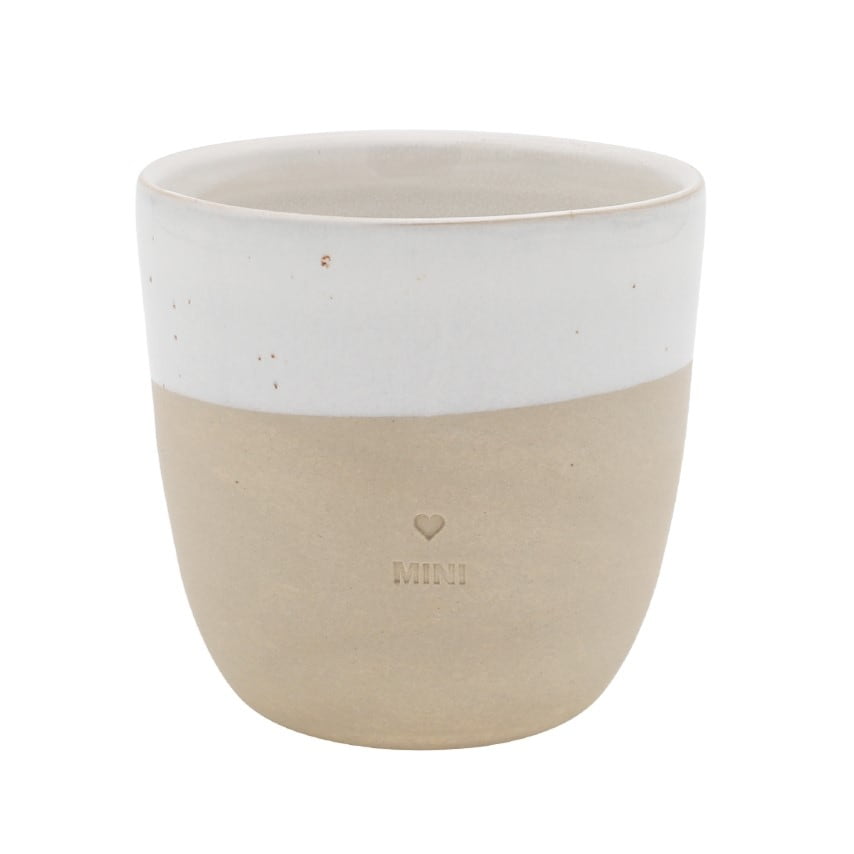 Hrnčeku dominujú zemité odtiene na čele s béžovou. Horná polovica je máčaná do tlmene bielej glazúry, ktorá je kontrastom k spodnej polovici hrnčeka, tá naopak zostáva v surovom prevedení. Tu sa nachádza vyrytý nápis Mini a srdiečko.