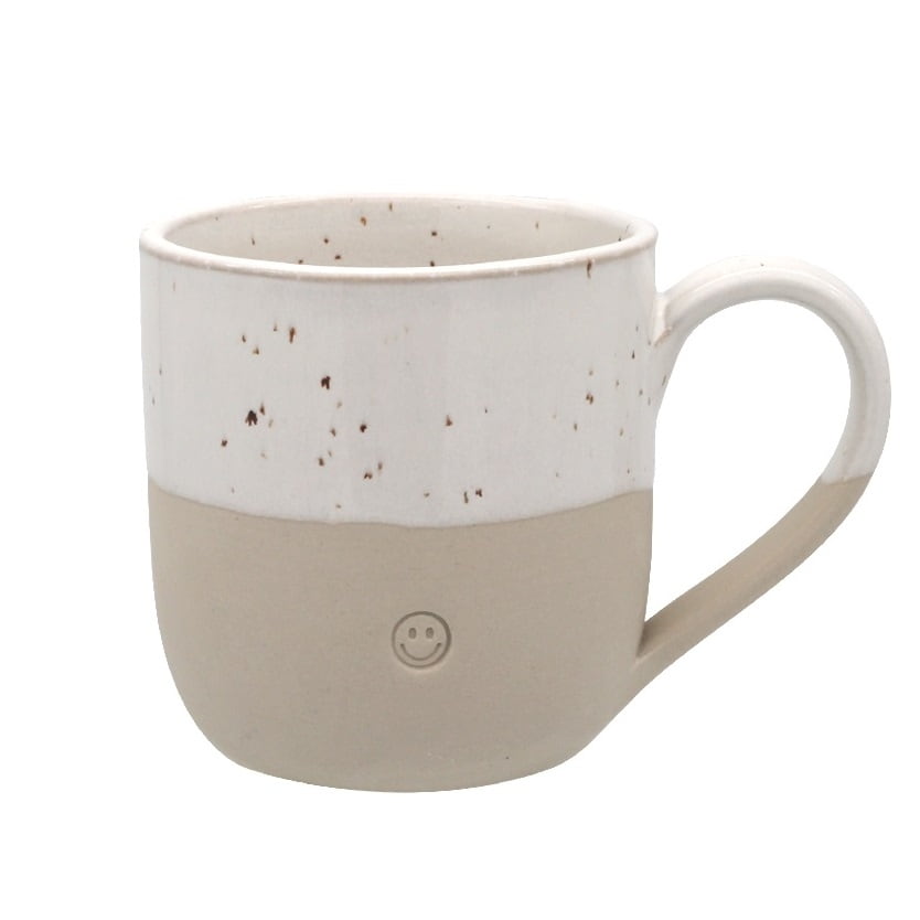 Dominujú zemité odtiene s béžovou v popredí. Horná polovica hrnčeka je ponorená do tlmenej bielej glazúry, ktorá kontrastuje so spodnou polovicou, ktorá zase zostáva surová. objem 190 ml / priemer 6,7 cm / výška 7,4 cm Vyrobené z kameniny.