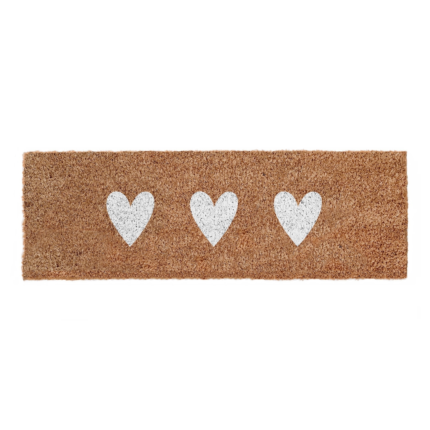 Prírodné kokosové vlákna zdobí potlač troch bielych sŕdc, ktoré srdečne privítajú návštevníkov. Rohožka udrží čistotu vstupného priestoru a môže byť aj odkladacím miestom na špinavú obuv.