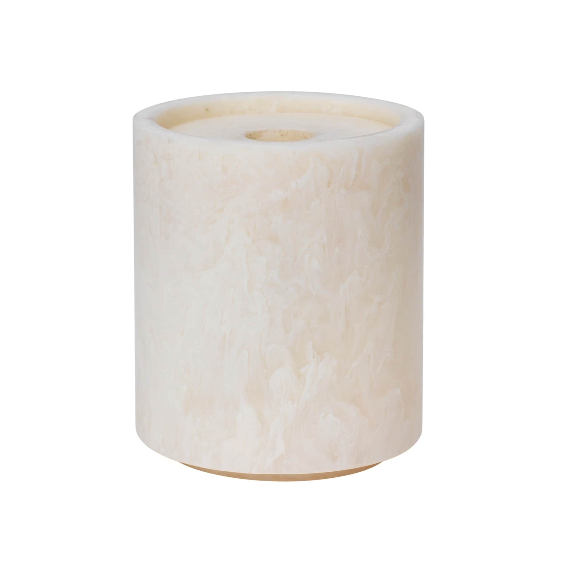 Úložná dóza je vyrobená zo živice pripomínajúcej mramor. Jej textúra v perleťovo ružovom odtieni dodáva každému kusu jedinečný charakter. Okrúhla základňa a čisté línie vytvárajú sofistikovaný vzhľad, ktorý sa ľahko začlení do širokej škály interiérov.