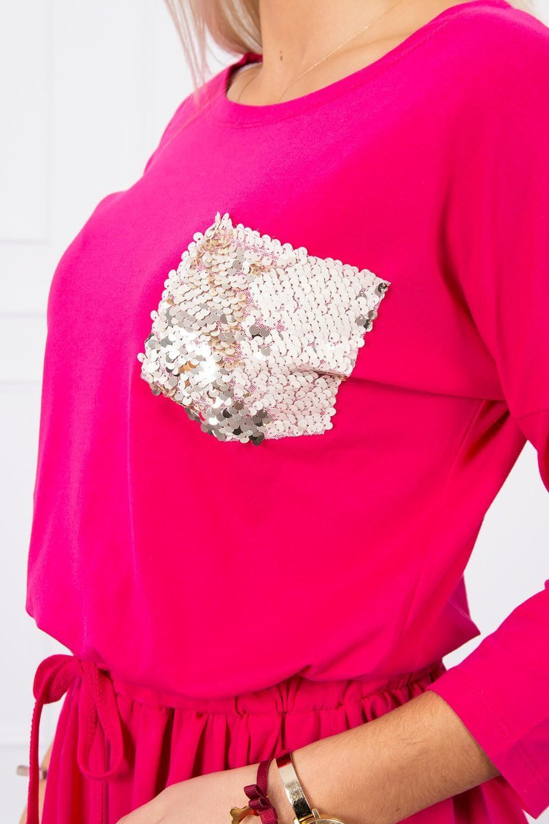 Módne šaty s vreckom Šaty s vreckom s flitrami. Šaty majú v páse viazanie. Skvelá ponuka pre všetky dámy. Šaty sú vyrobené z kvalitného materiálu. Materiálové zloženie:: materiál: 90 % bavlna, 10 % elastan Veľkosť je univerzálna a vyhovuje dámam, ktoré nosia veľkosť S, M alebo L. Rozmery: Šírka v podpazuší: 48 cm Celková dĺžka 91 cm Dĺžka rukáva od podpazušia: 28 cm Šírka v páse: 28 cm/ 47 cm po natiahnutí