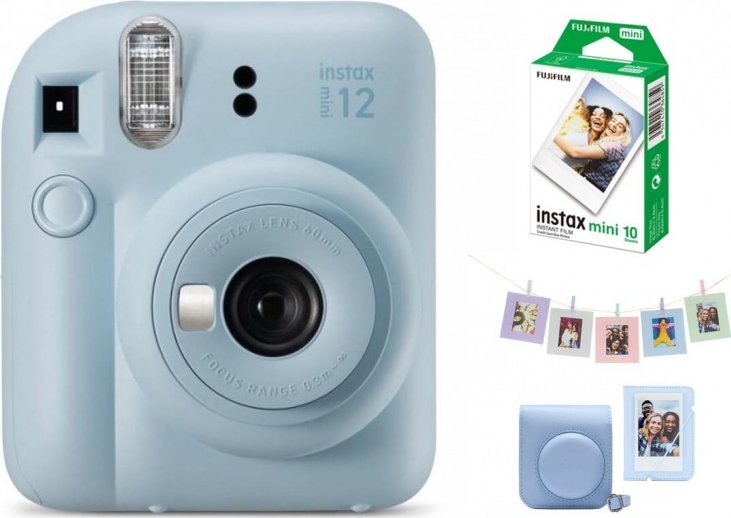 Fujifilm Fujifilm Momentinis fotoFotoaparátas instax mini 12 PASTEL Mėlynas + PRIEDŲ rinkinys (DĖKLAS, ALBUMAS, RĖMELIAI SU SEGTUKAIS) + instax mini glossy (10p