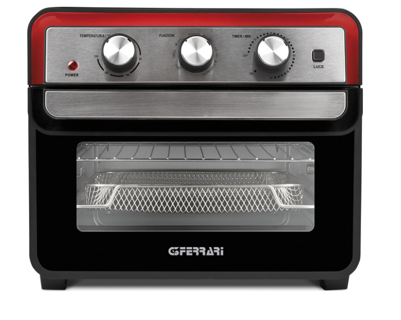 G3 Ferrari Friggisano 22L. Typ produktu: Teplovzdušná fritéza, Objem: 22 l, Teplota (max): 230 °C. Typ konštrukcie: Single, Farba produktu: Čierna, Typ ovládania: otočné. Výkon: 1700 W, Vstupné striedavé napätie: 230 V, Vstupná frekvencia striedavého prúdu: 50/60 Hz. Šírka produktu: 405 mm, Hĺbka produktu: 375 mm, Výška produktu: 350 mm