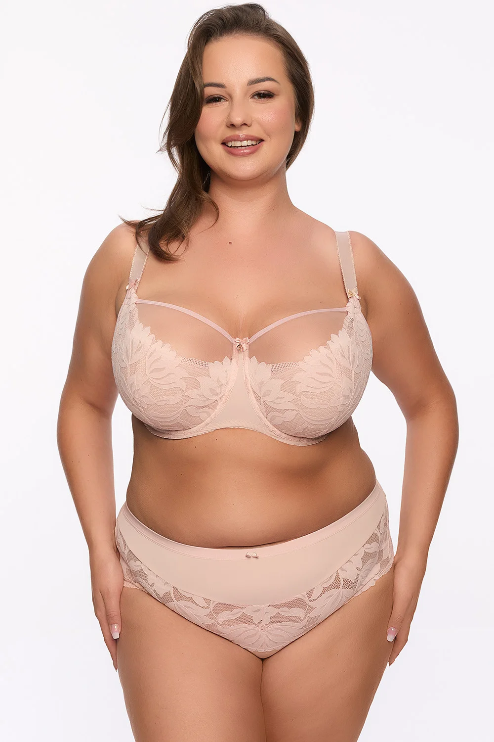 Podprsenka Gaia, model 1134M Keto Maxi, s drôtmi, ktoré podporujú a tvarujú prsia. zvislé kostice na bokoch. nastaviteľné ramienka, neodnímateľné. kovové háčiky na ramienkach. zapínanie na háčiky a očká. 3 rady zvislých háčikov. 3 úrovne vodorovných háčikov. vyrobené z 57 % polyamidu, 18 % bavlny, 10 % elastanu, 10 % polyesteru, 5 % polyuretánu. dámske oblečenie.