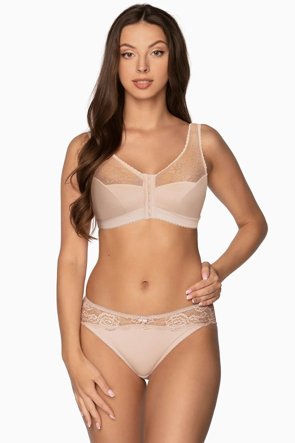 Podprsenka Gaia. Model 1163 Rachela. Výrobok má nastaviteľné popruhy bez možnosti odopnutia. Kovové háčiky na popruh. Podprsenka so zapínaním na háčiky a oči. Zapínanie: vpredu. Výrobok je vyrobený z 85% z polyamidu a 15% z elastanu. Výrobok pre ženy.