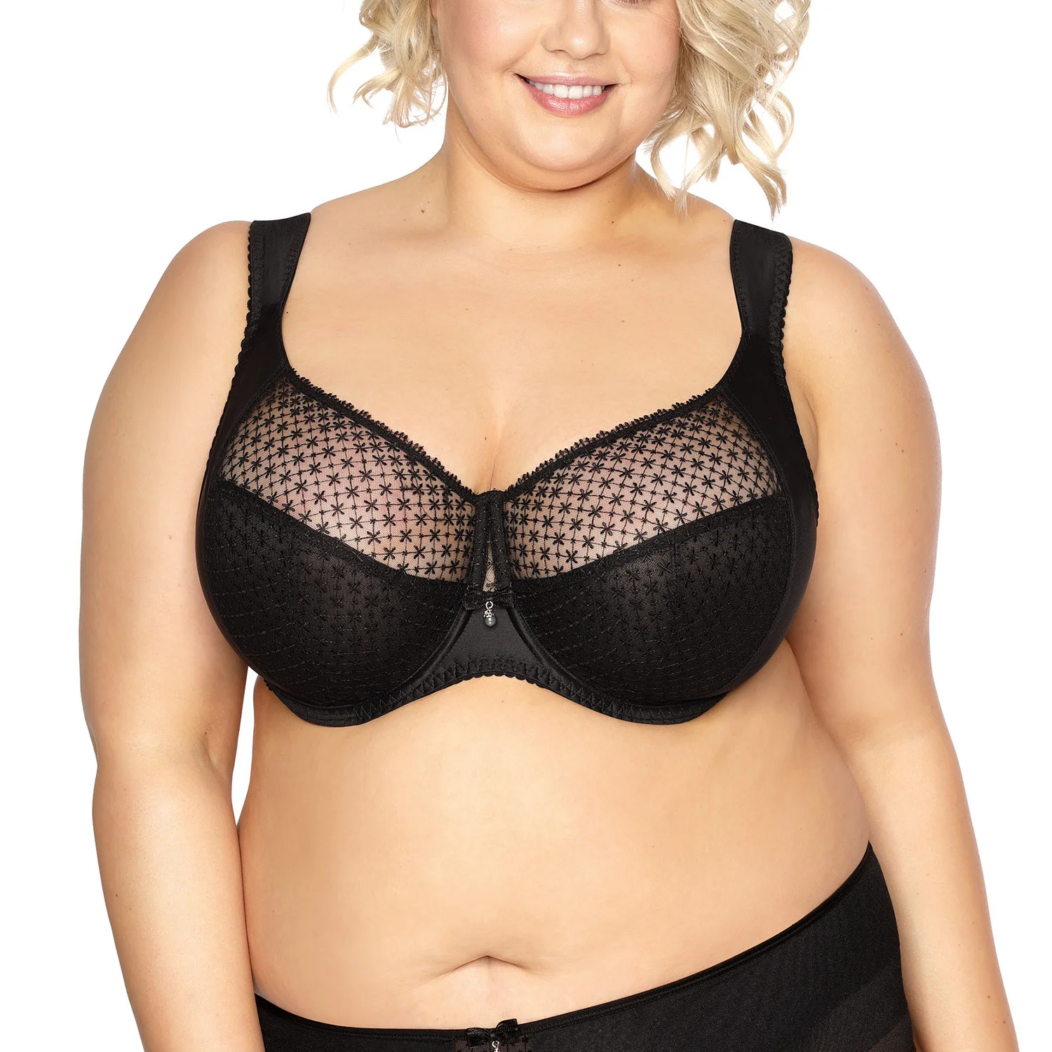 Podprsenka Gaia, model 874M Samira Maxi. má drôtiky, ktoré podporujú prsia a správne ich tvarujú. zvislé kostice na bokoch. výrobok má nastaviteľné ramienka bez možnosti ich odopnutia. podprsenka sa zapína na háčiky. miesto zapínania: na chrbte. 3 rady zvislých háčikov. 3 úrovne vodorovných háčikov. výrobok je vyrobený z 91 % polyamidu, 9 % elastanu. dámsky výrobok. prednosti výrobku: klasika pre väčšie prsia.