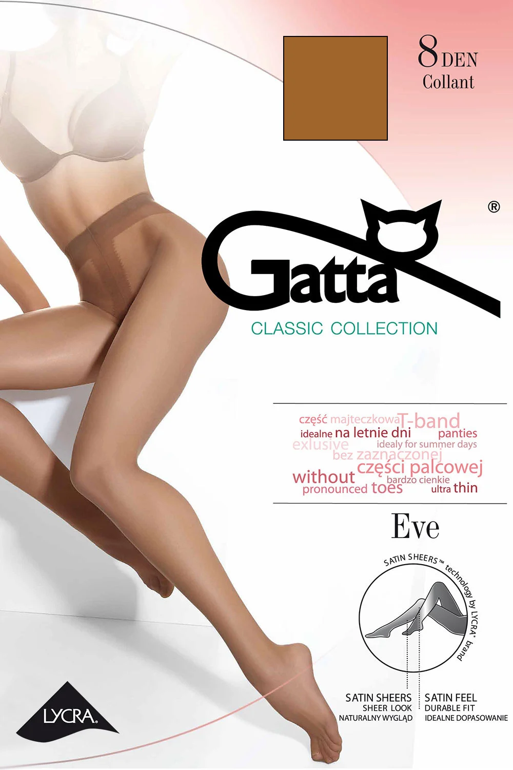 Pančuchový tovar značky Gatta. Model EVE. Výrobok je vyrobený z 85% z polyamidu a 15% z elastanu. Výrobok pre ženy.