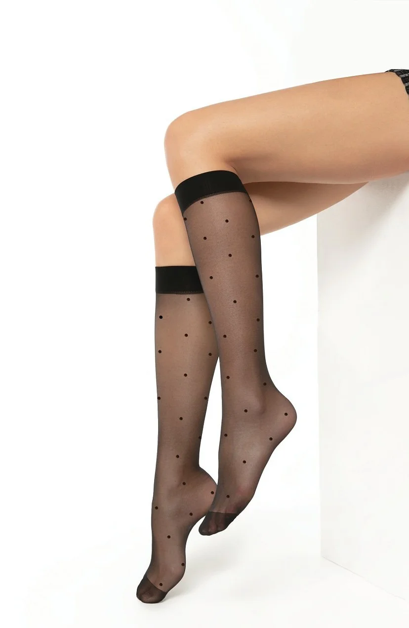Dámske podkolienky- bodkovaná mikroretina- hrúbka 20 denierov- rebro s jemným volánomZloženie: 89% polyamid, 11% elastan
