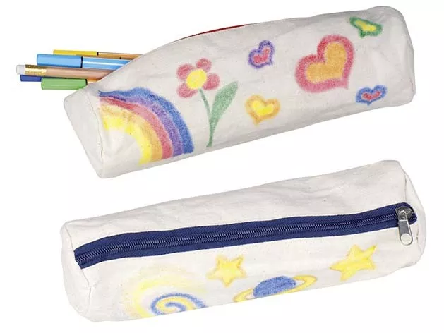 Bavlnené puzdro určené na vymaľovanie textilnými voskovkami, praktické na uloženie pasteliek a iných drobností.