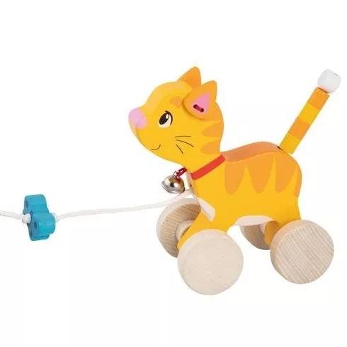 Jednoduchá drevená hračka v podobe žltej pásikavej mačičky s rolničkou, určená pre najmenšie deti pri objavovaní prvých krokov.