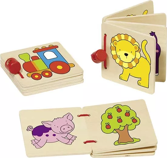 Drevená knižka s rôznymi obrázkami, určená pre malé deti. Jednoduché prevedenie a pevný materiál z preglejky.