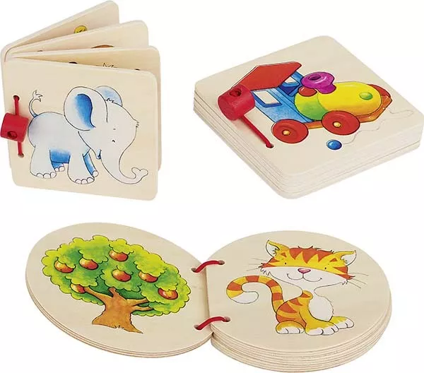 Veľké drevené obrázkové knižky ukazujú vo veselých a pestrofarebných ilustráciách predmety a zvieratká, ktoré deti poznajú zo svojho okolia. Knižky podporujú nácvik pomenovávania motívov, napodobňovania zvukov a rozpoznávania farieb.