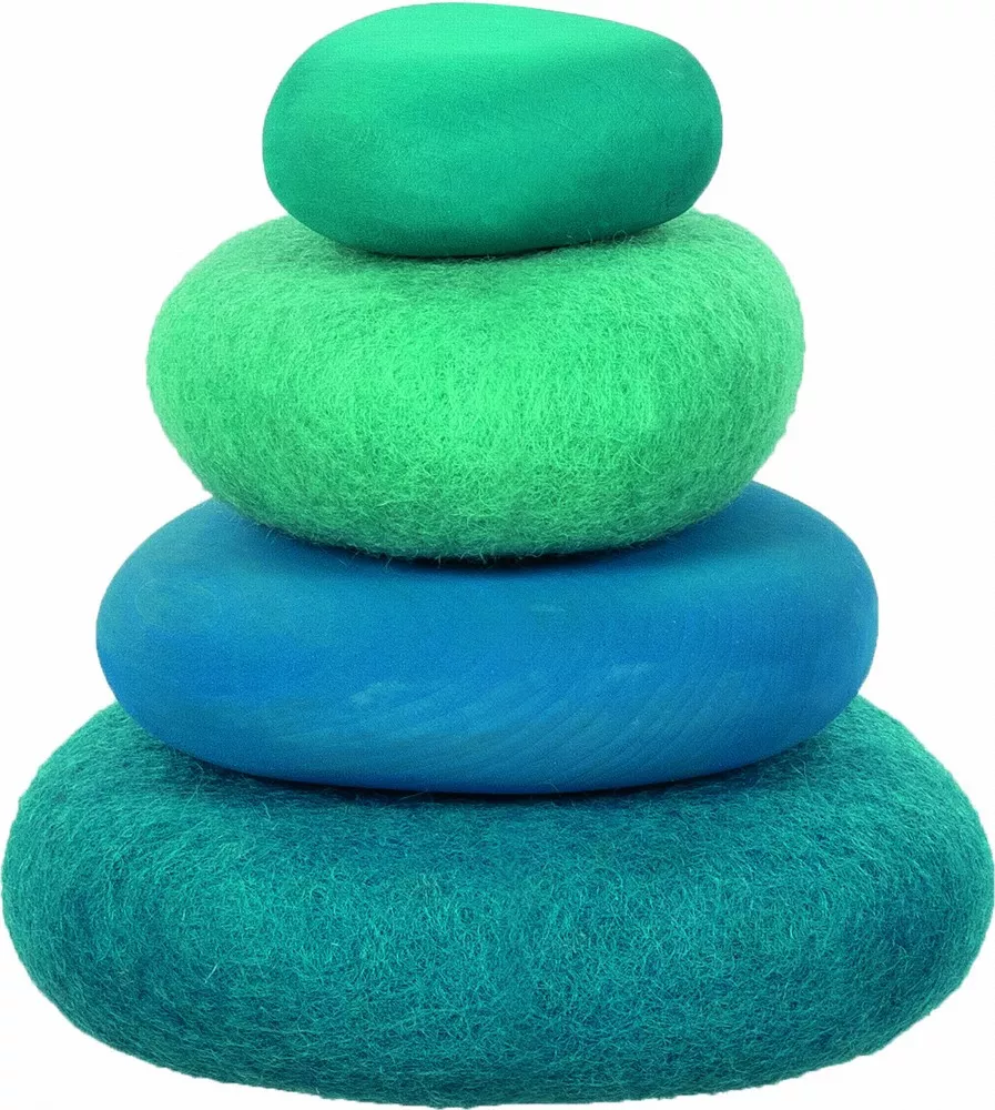 Hra kombinujúca prírodné materiály v upokojujúcich modrých odtieňoch. Kamienky z vlneného filcu a dreva ponúkajú jednoduché a všestranné spôsoby hry, ktoré deti motivujú k objavovaniu a tvorivej hre.