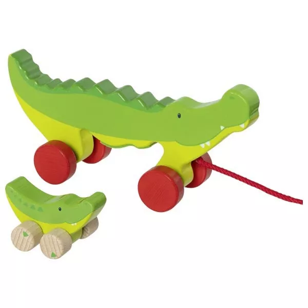 Ťahacia drevená hračka zložená z dvoch prepojených častí — dospelého krokodíla a mláďaťa. Diely sa dajú od seba oddeliť a používať samostatne, každý má vlastné kolieska a dá sa ťahať aj tlačiť.