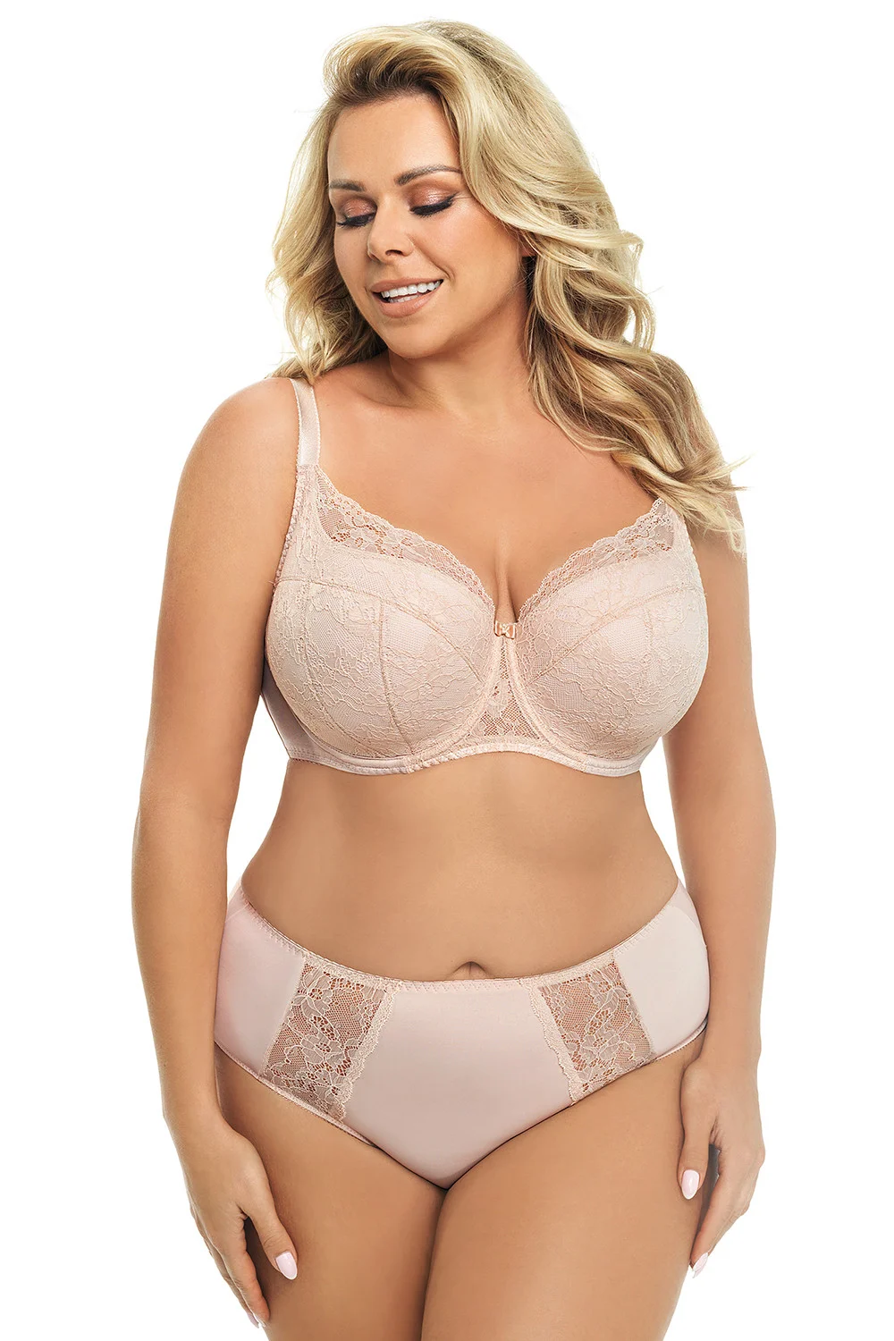 Podprsenka Gorsenia, model K483 Peony, má drôtiky, ktoré podporujú a tvarujú prsia. Zvislé kostice na bokoch. Výrobok má nastaviteľné ramienka bez možnosti odopnutia. Zapínanie na háčiky a očká. Miesto zapínania: na chrbte. 2 rady zvislých háčikov. 3 vrstvy vodorovných háčikov. Výrobok je vyrobený z 90 % z polyamidu, 7 % z elastanu, 3 % z polyesteru. Vlastnosti výrobku: čipkovaná dámska podprsenka s plným košíčkom na leto.