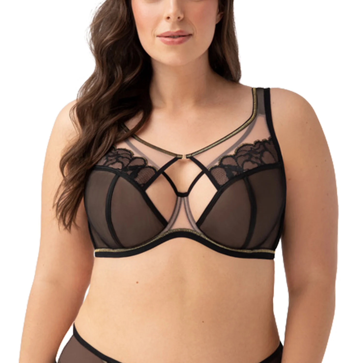 Podprsenka od Gorsenia. Model K758 Saanvi. Má drôty, ktoré prsia vhodne tvarujú. Zvislé veľrybie kosti zasadené po stranách. Výrobok má nastaviteľné popruhy bez možnosti odopnutia. Kovové háčiky na popruh. Podprsenka so zapínaním na háčiky a oči. Upevňovací bod: vzadu. Výrobok je vyrobený z 90% z polyamidu, 7% z elastanu a 3% z polyesteru. Výrobok pre ženy.