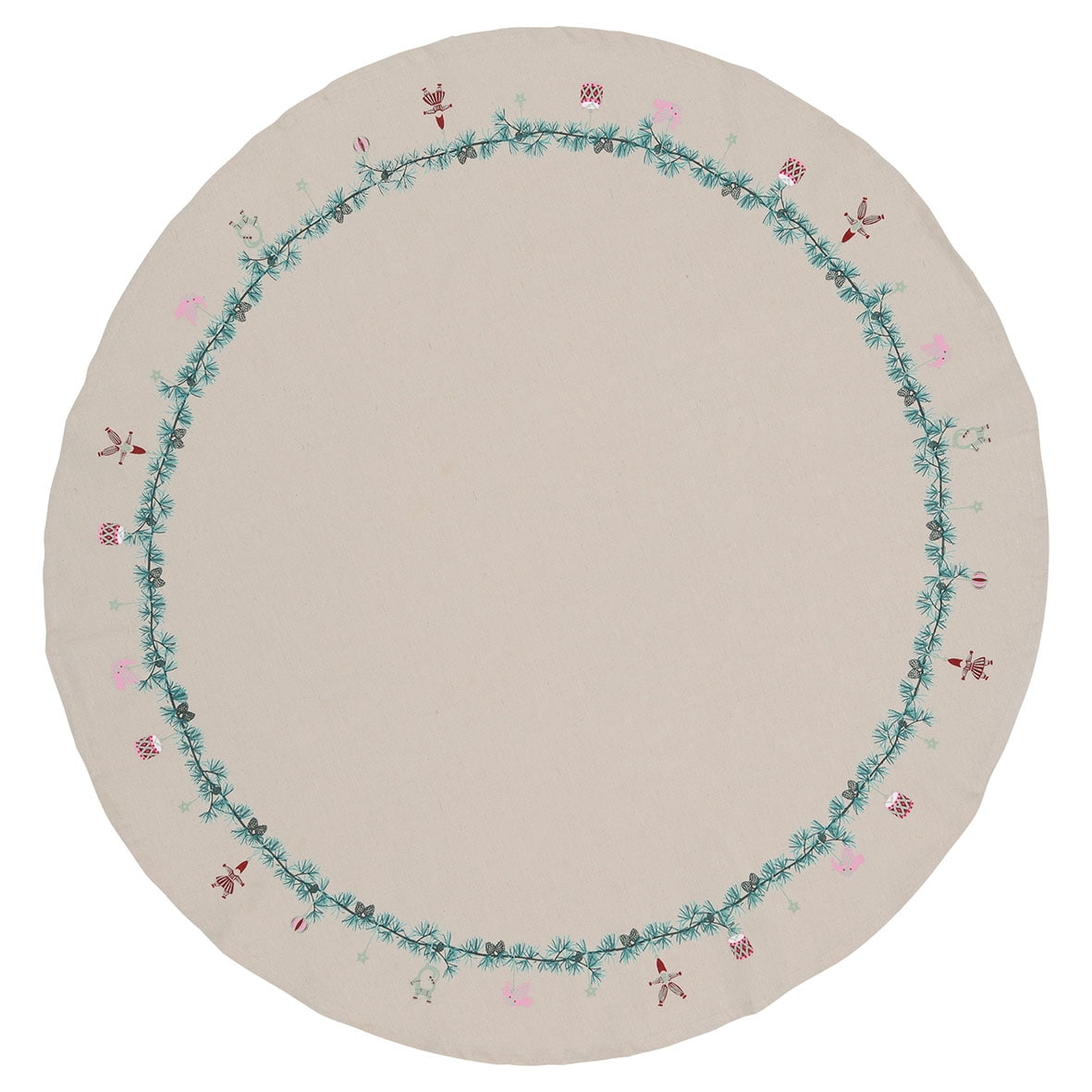 Decentne zdobený obrus s priemerom jeden meter na prírodnom pieskovom podklade necháva vyniknúť vianočnú dekoráciu smrekovcovej vetvičky so šištičkami a vianočnými ozdobami, ktorá lemuje okraj a vytvára tak krásny ucelený dekor. priemer 100 cm Vyrobené z bavlny.