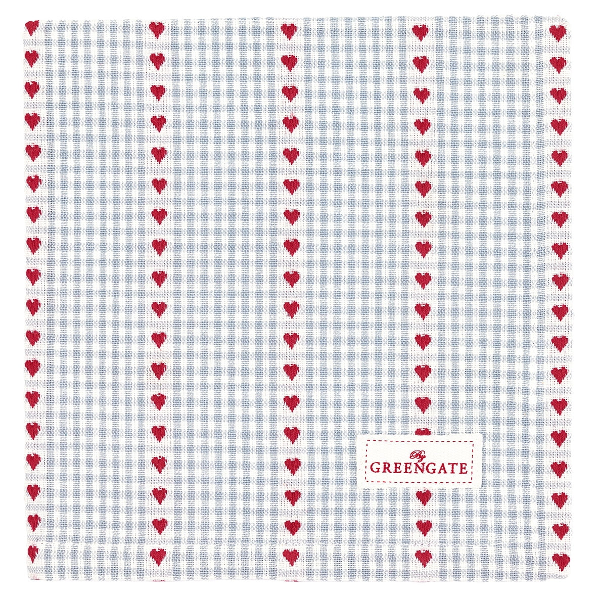 Látkový obrúsok z kolekcie Bea Grey v nežnom prevedení s červenými srdiečkami sa bude krásne vynímať na jednofarebnom obruse, v doplnení pestrofarebným riadom Green Gate.