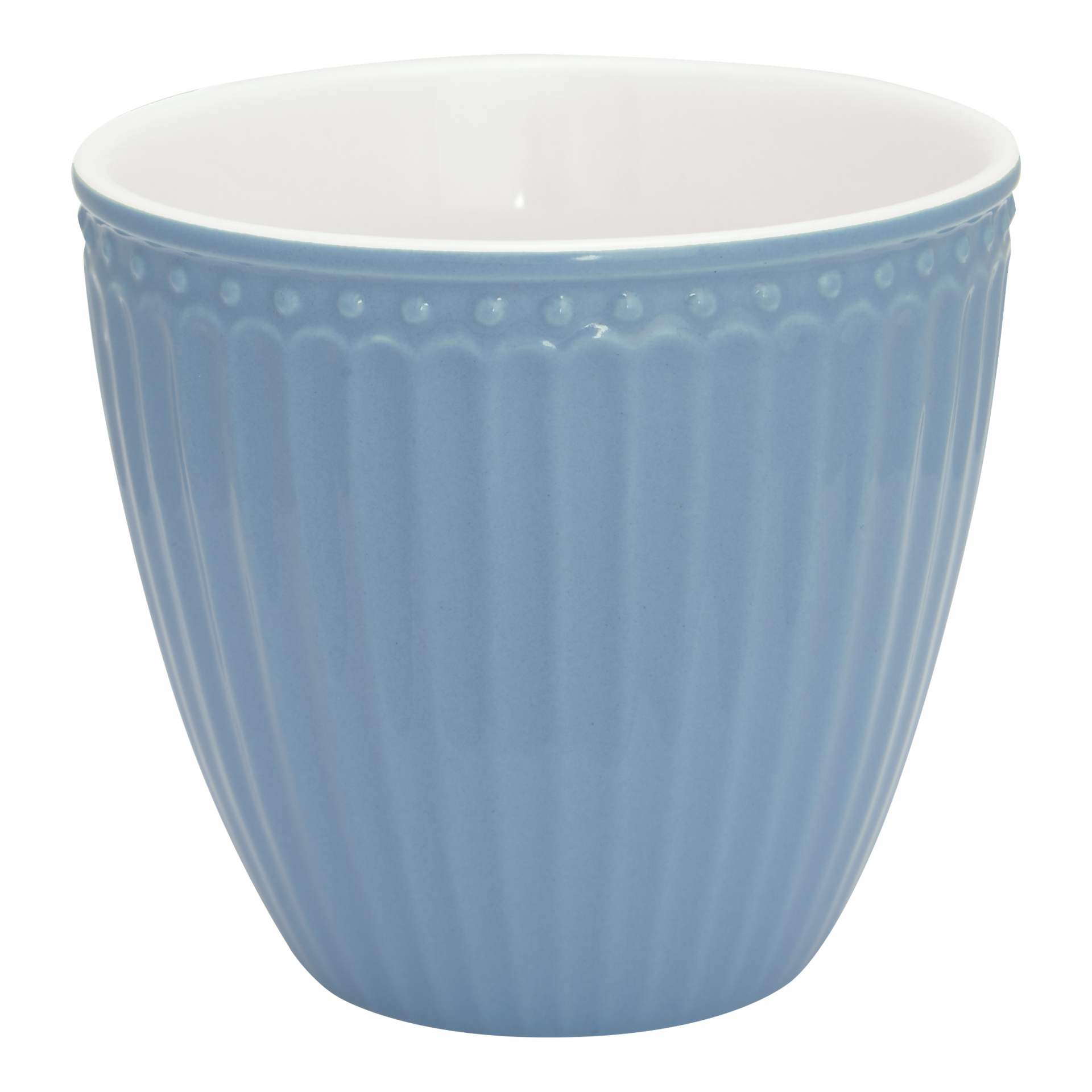 Krásna kolekcia keramického riadu Alice od dánskej značky Green Gate zdobená vrúbkami, rozžiari vašu kuchyňu! Modrý hrnček bez uška môžete využiť nielen na latte, ale aj na iné lahodné nápoje, ktoré vám spríjemnia deň.