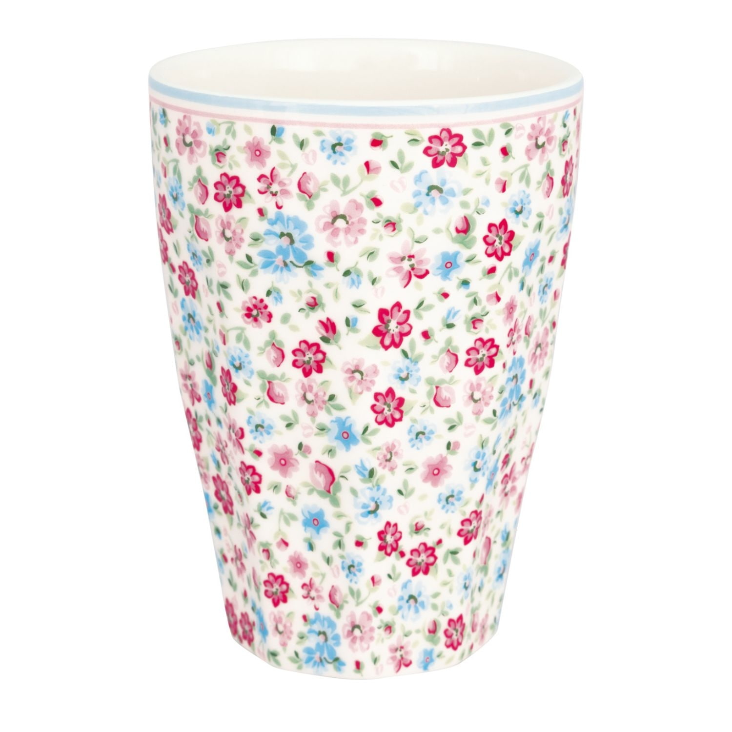 Vysoký porcelánový hrnček od dánskej značky Green Gate s krásnym motívom kvetov Louisa White je ideálny pre vaše chvíle pohody pri obľúbenom latte. Hrnček nemá uška a pri pití vám bude ohrievať ruky.